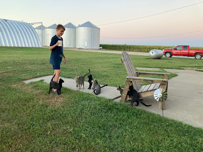 From our front porch we watched the first field harvested ~ from the first swath down to the very end kind of late that night. They did it all in one day. (Granted, 9:30 pm is late for me.)